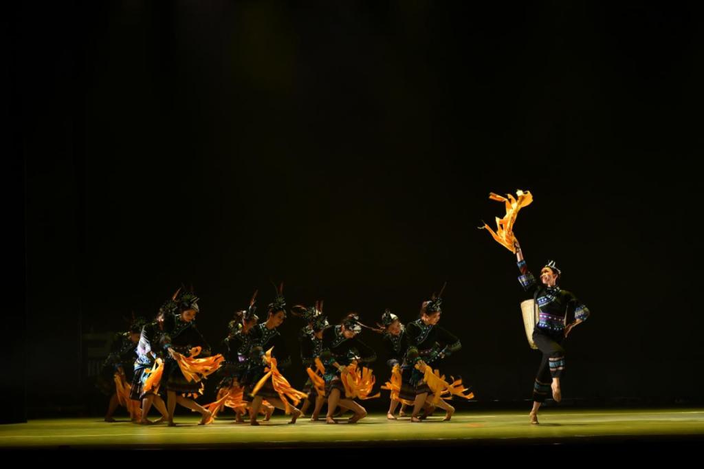 由伍彦谚、程思琰创作的苗族女子群舞《稻香十八洞》,以精准帮扶首倡地 “十八洞” 的山乡巨变作为宏大背景,巧妙汲取苗族非遗 “绺巾舞” 的动作元素。金色绺巾在舞者们手中缠裹、抛洒、拧摆、拂扫,生动描绘出 “稻田欢歌盈四野,金穗摇曳乐丰年” 的苗疆振兴景象,彰显出当代苗乡的昂扬正气,大力弘扬了十八洞的精神风骨。