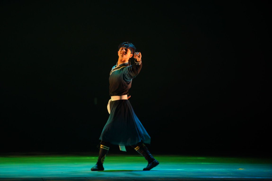 由伍彦谚和王峥老师共同指导的蒙古族男子独舞《牧童》,将蒙古大草原的自由奔放完美呈现在舞台上。舞者与 “骏马” 的互动活泼有趣,充分体现了蒙古族人民对美好生活的向往,赢得台下观众阵阵热烈掌声。