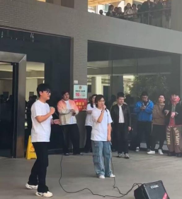音乐专业师生的创意改编歌曲《奢香夫人》接棒登场。音乐表演专业学生孟庆博、刘雅妮以阿卡贝拉人声伴奏搭配现代编曲,将凤凰传奇的豪迈曲风演绎出清泉般的空灵感。主唱刘雅妮同学以穿透力极强的嗓音诠释“越过绵绵的高山,越过无尽的沧海”,引得三层环形走廊挤满闻声而来的观众,掌声与喝彩声在建筑中庭形成立体声浪。