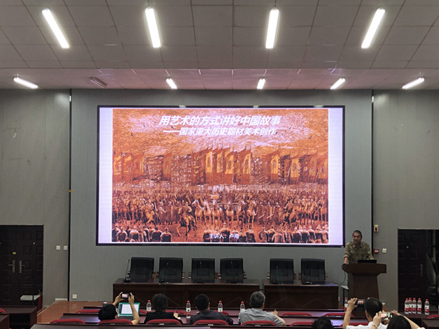 研讨交流会上,美术系卢雨教授以《用艺术的方式讲好中国故事——国家重大历史题材美术创作》为题与大家进行了分享,以讲好中国故事,发出中国声音开篇,阐释了重大历史题材美术创作的定义,介绍了具有历史转折意义的事件等十种重要表现题材。他以本人及师生共同创作的美术作品为例,总结了重大历史题材绘画的三个特征及历史题材绘画对课程、科研思政的重要意义。