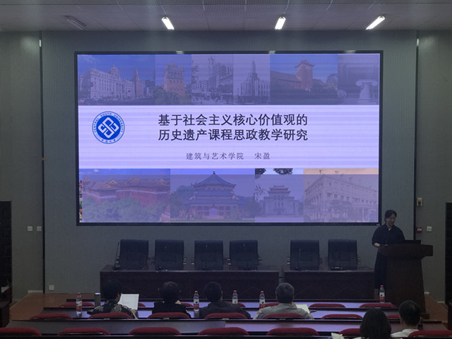 建筑系宋盈老师以《基于社会主义核心价值观的历史遗产课程思政教学研究》为题做主题发言,主要从四个方面展开:一是教学目标与学情分析,以专业目标和育人目标出发分析了学习状态、学生情况、学习困难等要素;二是创新理念与思路,从WHAT、WHO、WHY、HOW介绍了基于学情分析后的课程痛点及诊疗;三是创新方法与途径,介绍了嵌入PBL教学法的历史遗产课社会主义核心价值观课程群教学设计模式研究;四是创新效果与成果,最终以实现学生德智体美劳的全面发展。