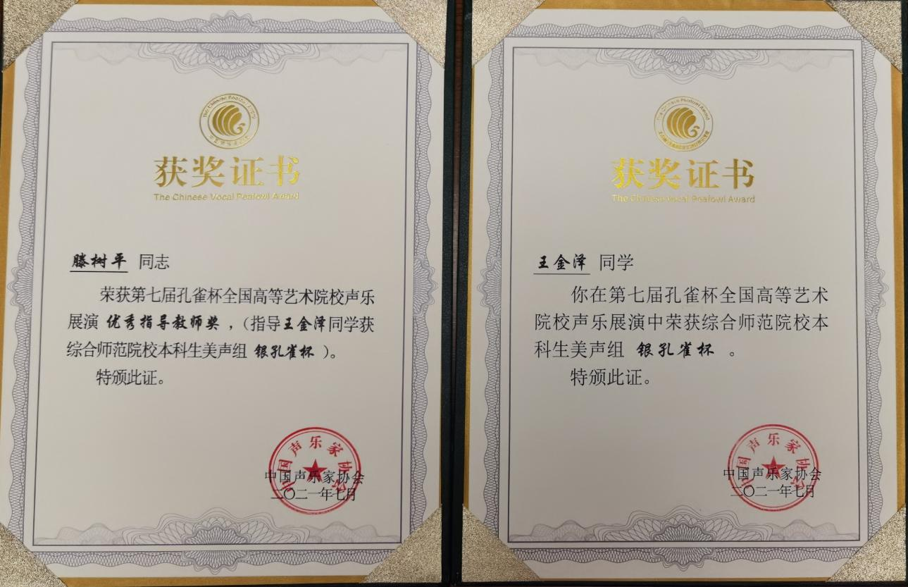 2021年7月22日至28日,“第七届孔雀奖全国高等艺术院校声乐大赛”在四川成都举行。本次大赛共有来自全国209所院校2171名选手参加,经过激烈角逐,我院音乐舞蹈系大三学生王金泽荣获综合师范院校(本科生)美声组“银孔雀”奖,专业导师滕树平副教授荣获“优秀指导教师奖”,69书吧