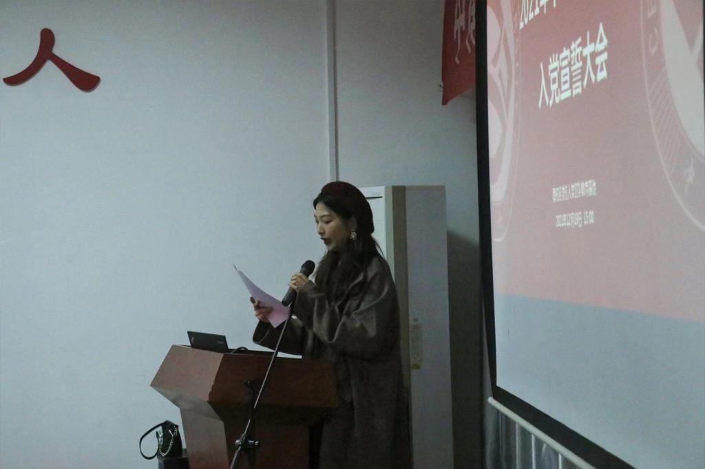 入党宣誓后,预备党员代表音乐表演本科生支部毕悦仪同志发言,她表示,作为青年预备党员,是一份荣耀,更是一份责任与担当,意味着责任和义务已落在新一代人的肩膀。各位预备党员不仅是学生,是孩子,是社会成员,是国家未来栋梁,更是一名光荣的中国共产党预备党员,要在学习、思想、工作中持续奋斗、顽强拼搏,以实际行动践行自己的誓言与承诺。