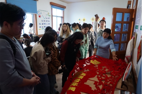 在长沙县江背镇新晴剪纸工作室,长沙县县级非遗“民间剪纸技艺”代表性传承人罗晴(下图右一)向我们调研团一行介绍她的剪纸作品,并回答师生们提出的各种问题。长沙县的民间传统剪纸分为单色剪纸、彩色剪纸、立体剪纸三大类,常常把多种物象组合在一起,表达丰衣足食、人丁兴旺、健康长寿、万事如意的理想和愿望。在传统的剪纸基础上她延伸剪纸的表现内容,扩展了剪纸的现代应用场景。