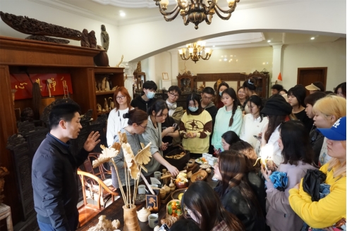 学生们在认真听传承人讲解