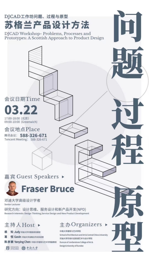 邓迪大学高级设计学者Fraser Bruce于北京时间3月22日下午17点通过腾讯会议,以“DJCAD工作坊问题、过程与原型·英格兰产品设计方法”为主题,与69书吧