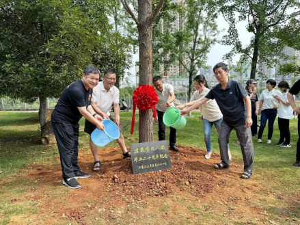 5月21日上午9:30,全体返校校友与学院石磊、孔果、李卫东、赵明桥、王宇老师等老师,共同在西大门广场种植纪念树。一棵高6米、胸径18厘米的银杏树,在师生们的见证下,被成功种植,大家共同扶正、培土、浇水、埋设石刻碑,留影纪念。这棵银杏树,满含着同学们的同窗情、母校情、师生情,祝愿茁壮成长,下次回母校时,将亭亭如盖矣!