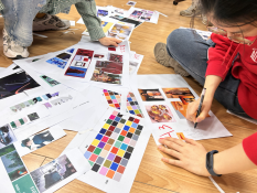 制作开始后,同学们很快进入了合作状态,小组内分工明确。其工作大致分为三个阶段:色彩初筛、拼贴制作和色彩命名与意象图补充。在第一阶段,小组4人分别从给定的资料册中筛选自己喜欢的颜色及其意象图,裁剪下来并将色彩放至桌面中心。在第二阶段,小组将桌面呈现色块及意象图贴至A3白纸,每个色彩一张,直至拼贴完成30组;第三阶段进行两两分组,一组同学为30个选定颜色命名,另一组同学继续搜集补充30个色彩的意象图,完善标签页。